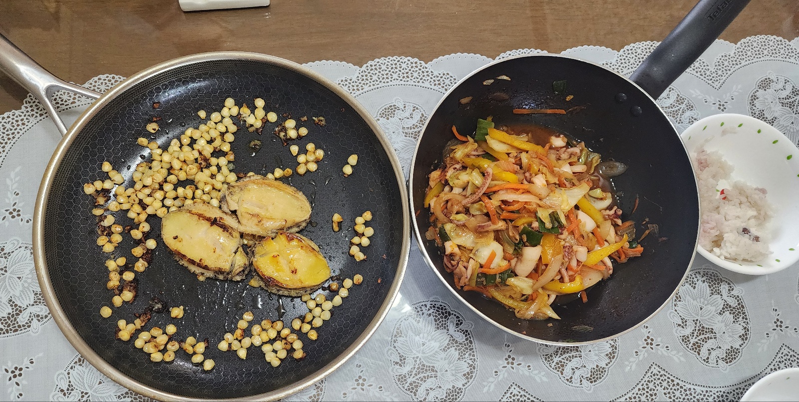 점심으로 전복버터구이랑 오징어볶음을 먹었다. 전복버터구이에 옥수수도 같이 넣고 볶으니 풍미도 더 살고, 씹는 맛이 있어서 좋았다. 난 전복버터구이를 정말 좋아한다. 스리라차 소스에 찍어서 먹었다.